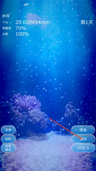 在水母养育界面,点击右侧的换水按钮,就能完成水质更换,保持水母生存环境的洁净,这是养育水母必不可少的操作之一。
