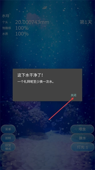 完成换水操作后,界面会弹出“这下干净了!一个礼拜至少换一次水”的提示,点击关闭按钮将其关闭,即可继续开展水母的其他养护工作。