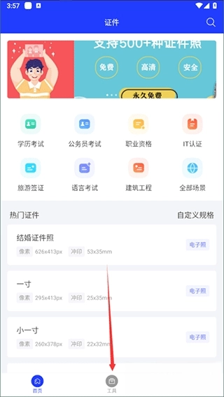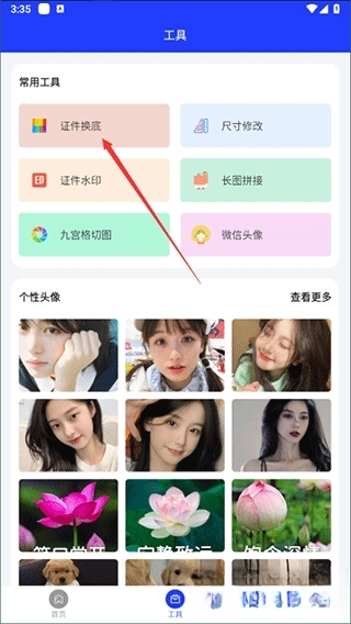 进入【工具】页面后,你可根据自身需求选择对应功能来编辑图片,下面我们以【证件换底】功能为例进行演示。