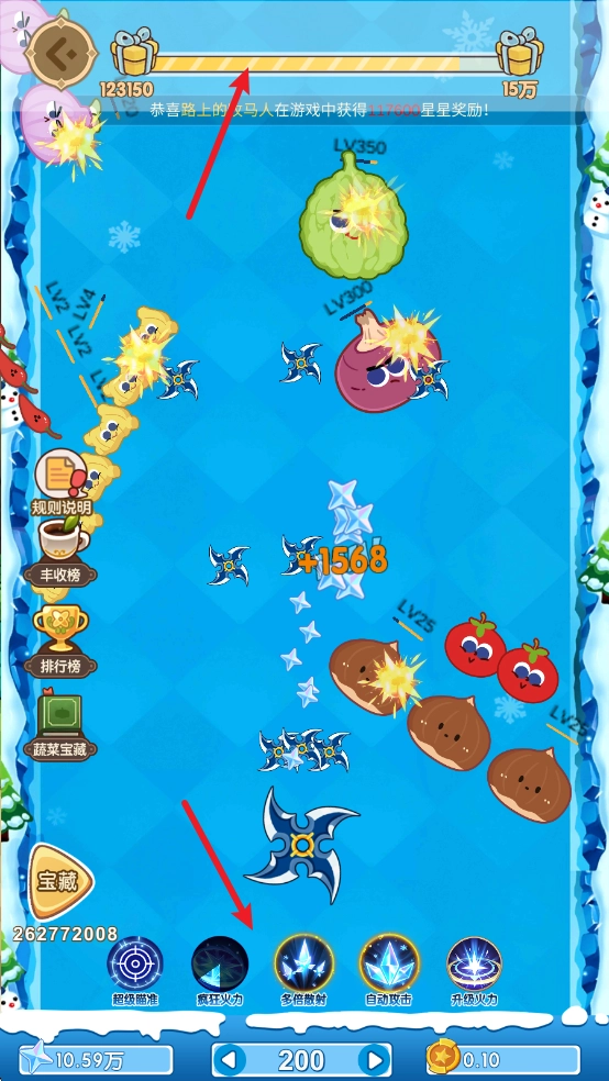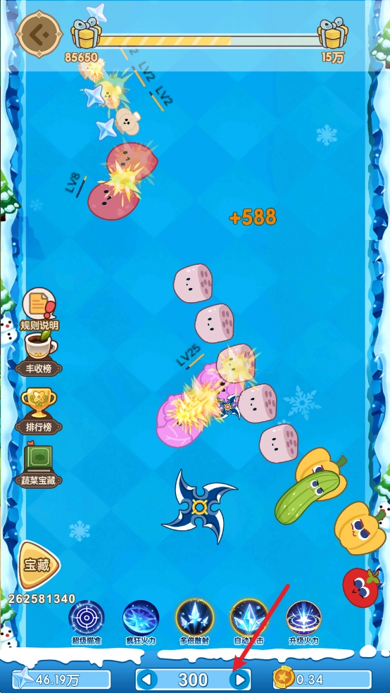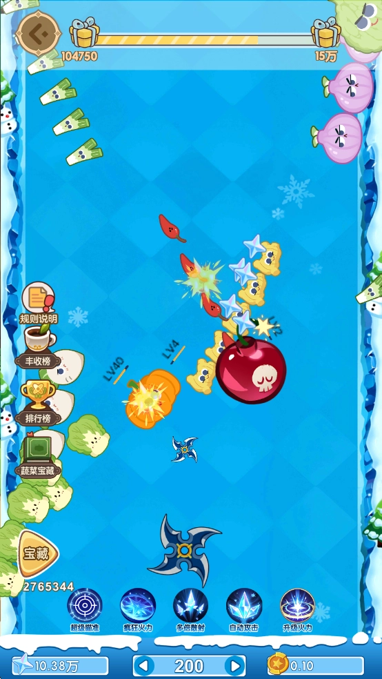 选择下方的散射等功能,能够为你提供更高的火力,消灭蔬菜将会获得积分。