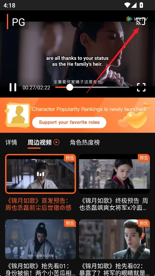 2、在播放页面点击右上角的“投屏”图标;
