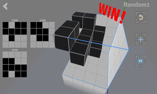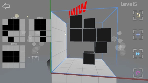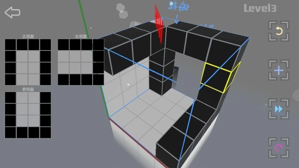 第一关的要求是:按照左视图、俯视图、正视图这三个视角方向,放置对应的方块。