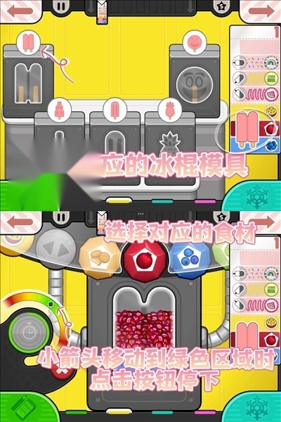 按照客人的需求,挑选对应的模具和食材,当小箭头移动到菱形方块处时,点击按钮使其停下。