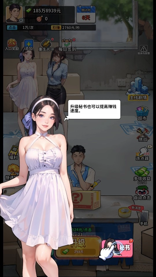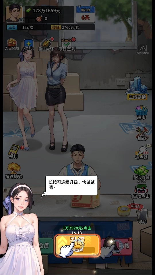 1、长按升级按钮,可以加速角色成长,提升收入效率;