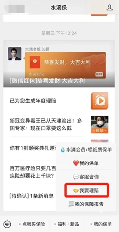 在水滴保公众号点击:我的保单-我要理赔。