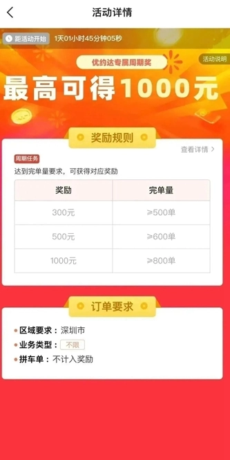 累计完单满500单奖励300元。