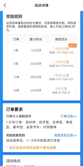活动时间为12月1日至12月31日。在此期间,司机满足以下不同出车时长与订单数量条件,可获得对应公里数奖励:有效出车2小时且完成3单,奖励1.45元/公里;有效出车5小时且完成8单,奖励1.75元/公里;有效出车8小时且完成12单,奖励1.85元/公里;有效出车11小时且完成16单,奖励2元/公里。