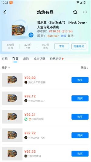 点击你想购买的饰品,就能看到该饰品的全部在售信息,而且价格会按从低到高排列。你可以查看每一件商品的详情,还能了解到该饰品的求购数量、在租数量以及在售数量。