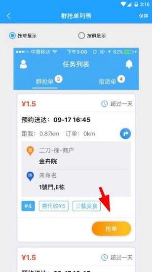 这里以【群抢单】为例,骑手只需点击自己心仪的外卖单对应的【抢单】按钮,一旦抢单成功,便能前往商家取餐并开展配送工作。
