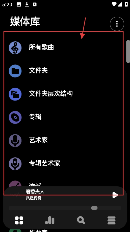 进入媒体库后,你会看到【所有歌曲】【文件夹】之类的分类选项,只要选择其中一个分类,就能浏览对应的音乐内容了。