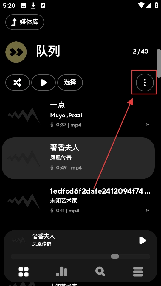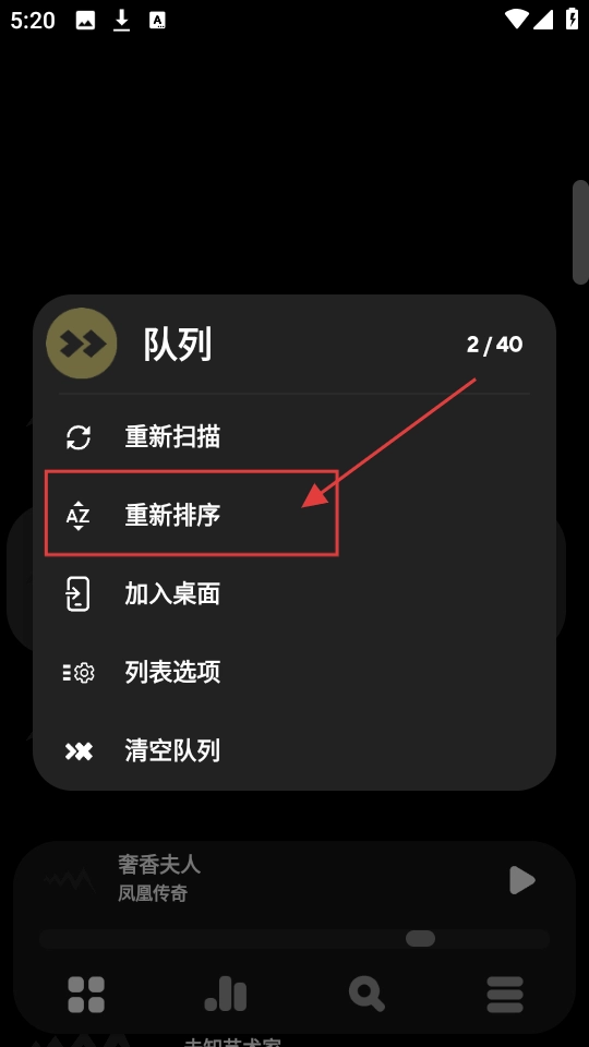 在功能选项菜单中,设有【重新排序】这一选项,点击该选项后,就能对队列中的音乐进行排序设置了。