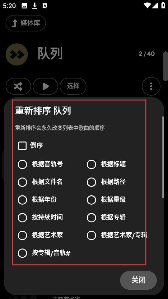 进入重新排序队列的界面后,这里提供了【倒序】【按音轨号】等多种排序选项,选择你偏好的方式,就能轻松调整音乐的播放顺序了。