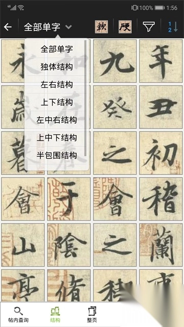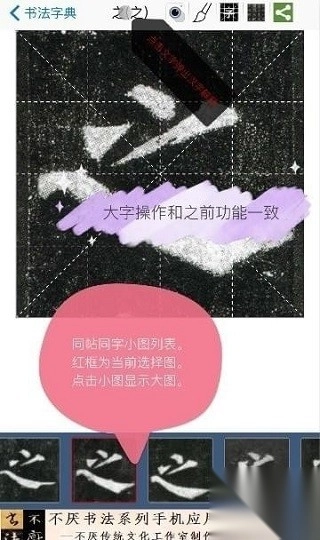 能对单字的书写结构进行分类解析,同时提供全文碑帖的展示。