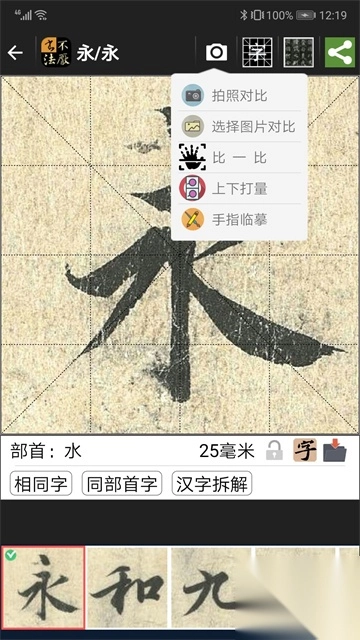 用户能够借助拍照或者上传手写字的方式,和碑帖原字展开对比与分析。
