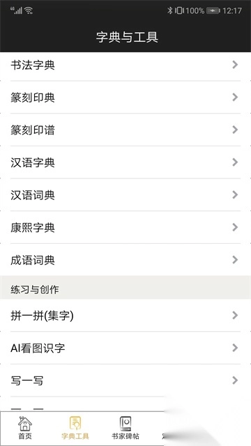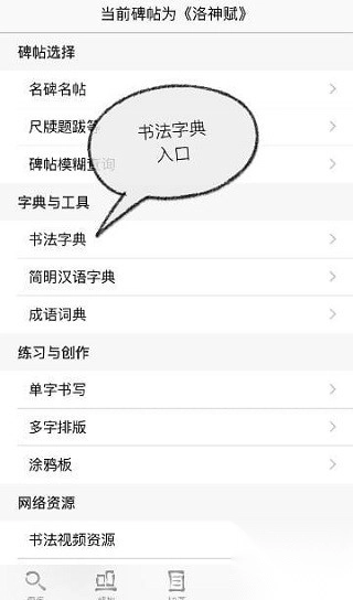用户可以在菜单选项栏里找到“书法字典”的入口,点击该入口就能进入书法世界。