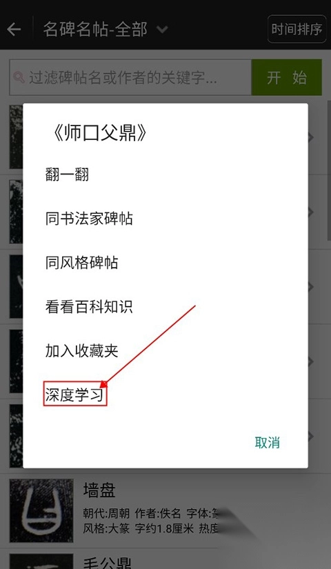 用户先选择一个书贴素材,接着点击页面底部的“深度学习”按钮,从而进入学习模式。