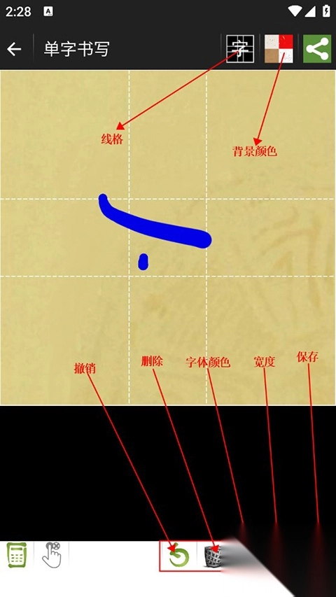 练习界面的右下方按顺序排列着撤销、删除、字体颜色、字体宽度、保存等功能按钮,而在界面的右上角,还设有虚线框与背景图的切换选项。