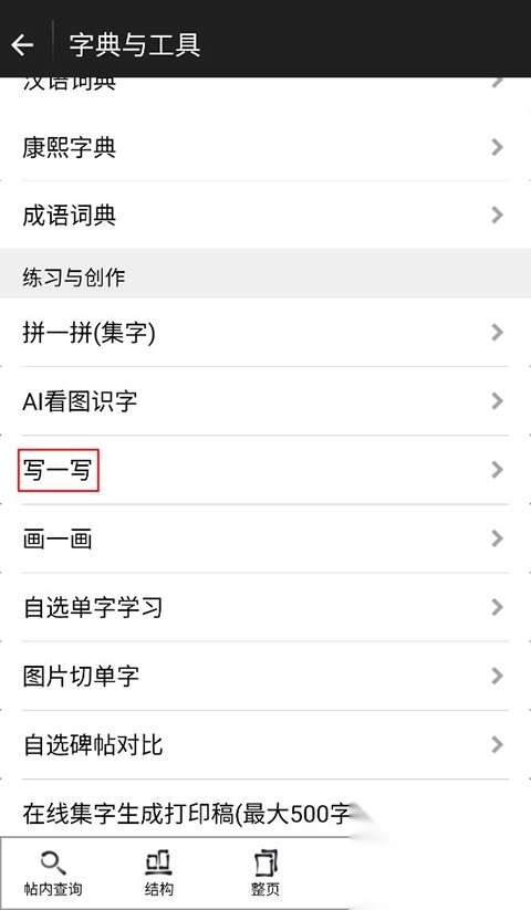 在工具栏里选中中间位置的“写一写”功能,就能正式开启书法练习啦。