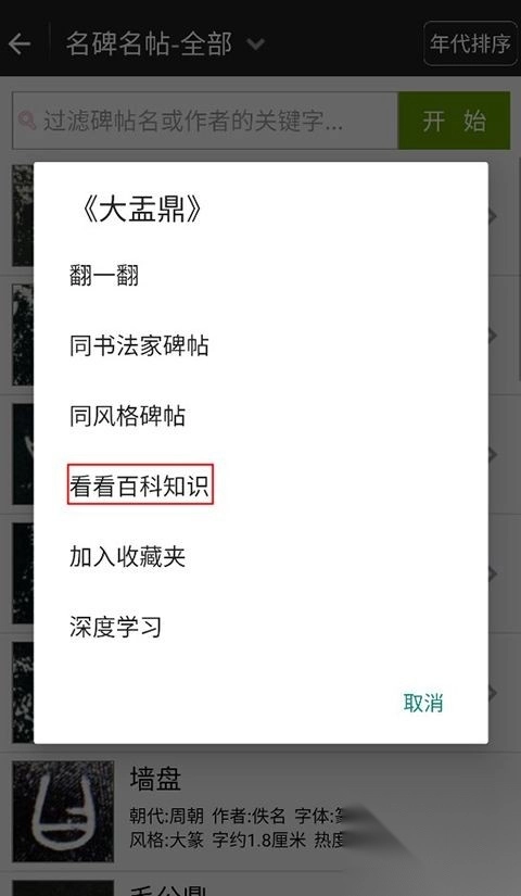碑帖百科:选择你感兴趣的碑帖并点击,即可使用“看看百科知识”功能,深入知晓该碑帖背后的历史渊源、创作背景以及相关的书法故事。