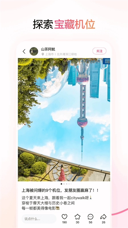 支持用户在线分享城市生活、发布精彩动态,将拍摄的大片、探索的小众地、整理的旅行心得分享给他人;同时可浏览他人分享内容,交流拍照与生活经验,打造温馨的生活分享社区。