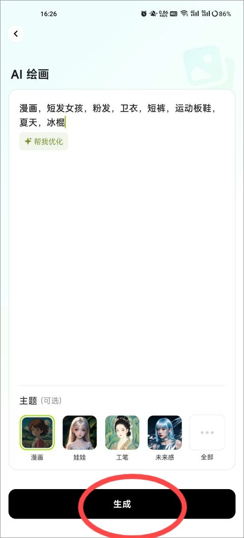 3、接着输入契合该画风的关键词,描述得越详尽,生成的效果通常会越理想,之后点击“生成”按钮就可以了。