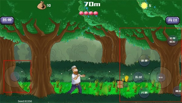 2、左下角应轮盘可以控制戴夫移动,右侧有各种功能菜单,包括闪避跳跃,近战,换弹射击以及拾取购买等。