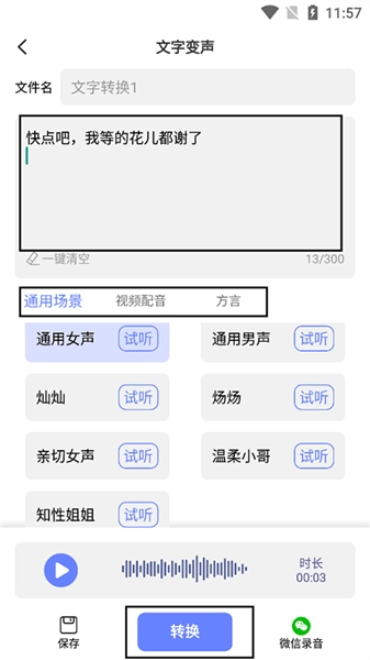 在文字编辑区域输入一段文字,接着挑选音效——这里不仅有通用的音效选项,变声器还额外支持部分方言音效呢!选好后点击“转换”按钮就能完成操作,试听觉得满意的话就可以保存下来,也能分享到微信平台。