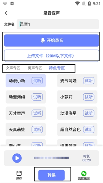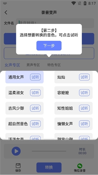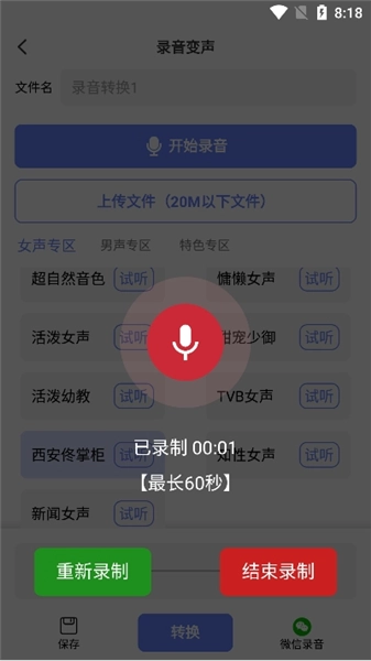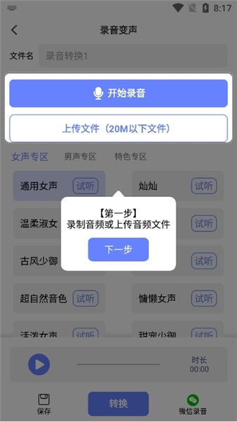 您可以先上传一段需要变声的音频,或者直接当场录制一段;接着在音效选项中挑选您想要的转换效果,这里设有女生专区、男生专区和特色专区供您选择;之后点击转换按钮,音频就能成功完成变声处理;完成后您可以试听转换后的效果,并且支持将处理好的音频分享到微信。