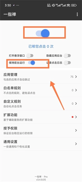 1、点击【蓝色按钮】开启服务、打开【保持前台运行】、点击进入【应用管理】