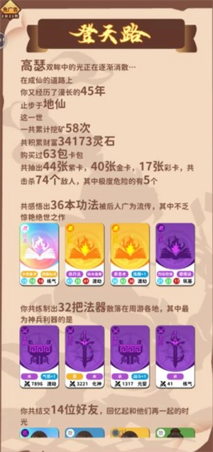 《卡包修仙》是一款以开卡包为核心玩法的肉鸽修仙游戏。玩家需通过挖矿获取资源、开启卡包提升修为与境界——每个卡包内含随机事件,每次轮回都能解锁全新功法选择。收集更多卡牌、突破层层境界,最终即可飞升成仙。