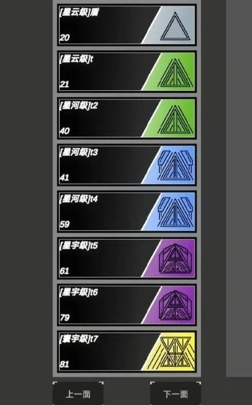 战舰级别(星尘星云星河星宇寰宇)和使用方块数量有关,20块以下(不含20)为星尘级,40以下为星云级,60以下为星河级,80以下为星宇级,80以上为寰宇级。