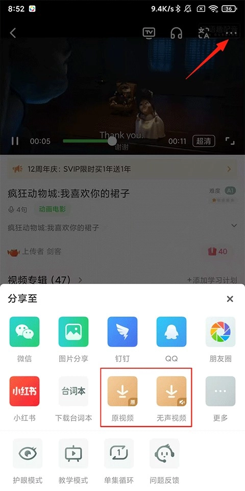 2、进入详情页后点击右上角的【...】扩展按钮,在弹出的功能列表中根据需求选择【原视频/无声视频】;