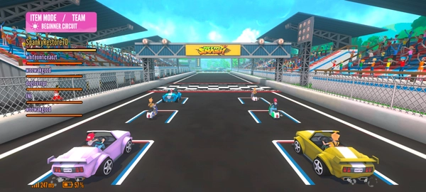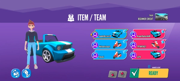 漂移、助推、粉碎效果,以及攻击与防御能力的强化。可以在大厅世界中组队——免费驾驶,支持8名玩家同场,还能语音聊天。