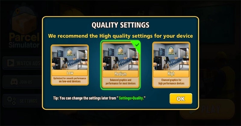 1.进入包裹递送模拟器3d游戏后选择画质。