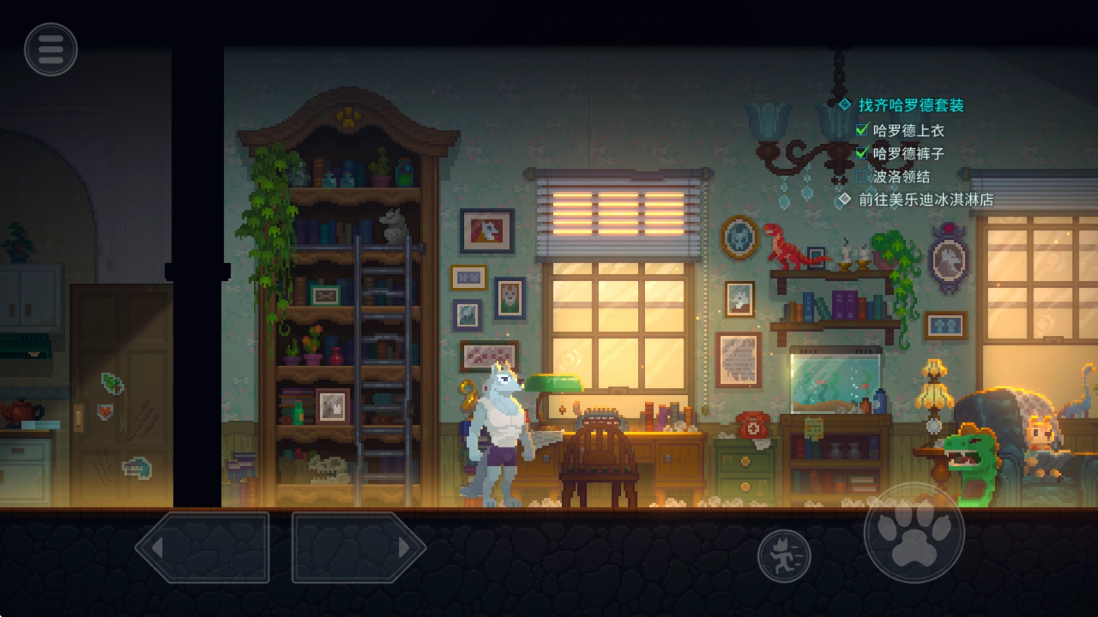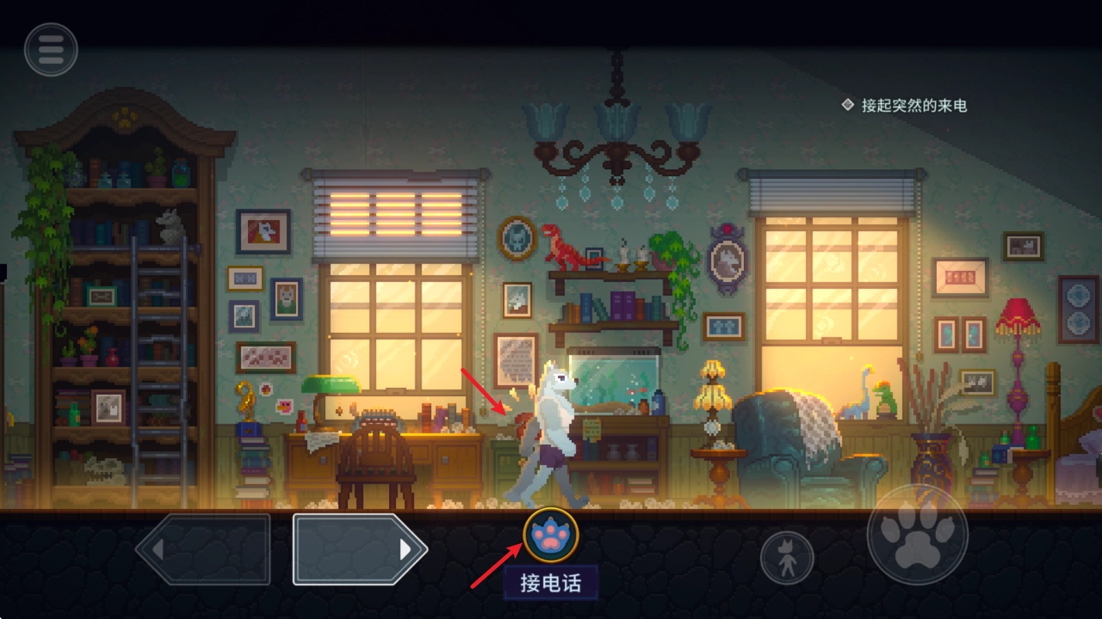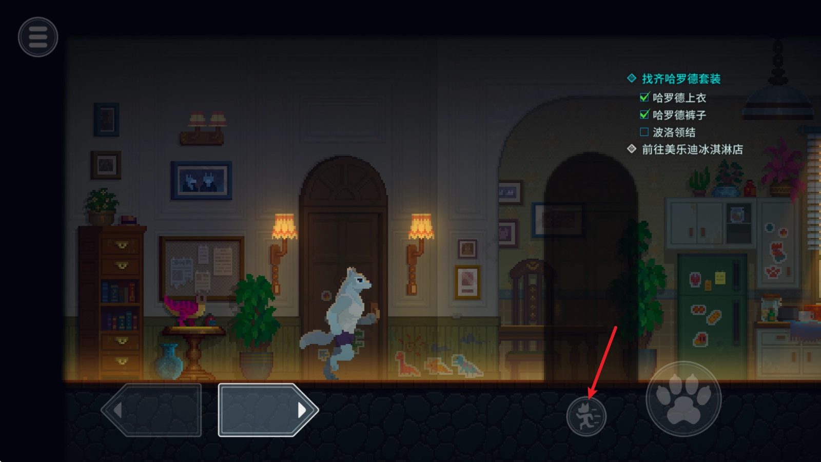 在游戏里,左边的方向键用来操控移动,当靠近物品时,交互按钮就会显示出来。