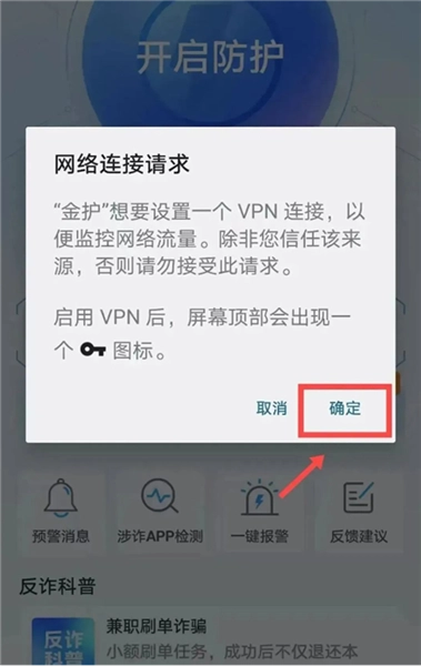 只要开启基础权限(60分),金护在安装后约1天左右就能实现预警功能。不过,金护的使用机制较为特殊,需要长期在手机中稳定运行,才能持续实时地守护大家的网络安全。因此,我们还是建议大家按照指引完成正确安装,让金护能够长期留存于手机中,时刻为大家的资金安全保驾护航。