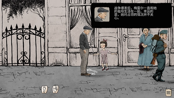 2.然后进入游戏,这里有足印和手掌,点击手掌可以和人物进行对话,还可以拿东西,足印可以在对话完成之后进入下个剧情;