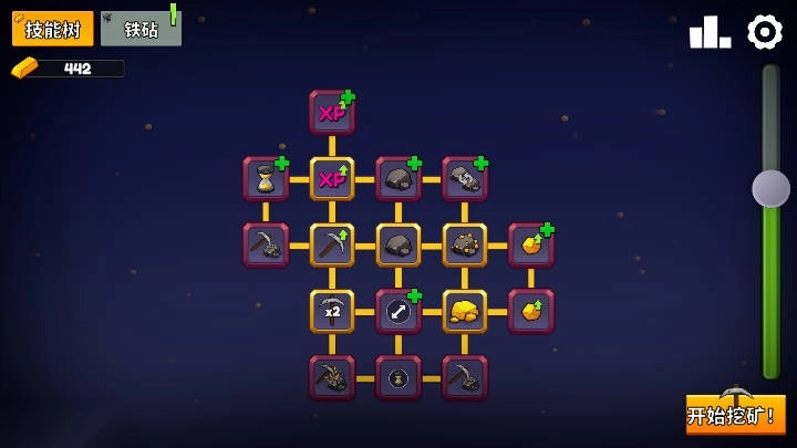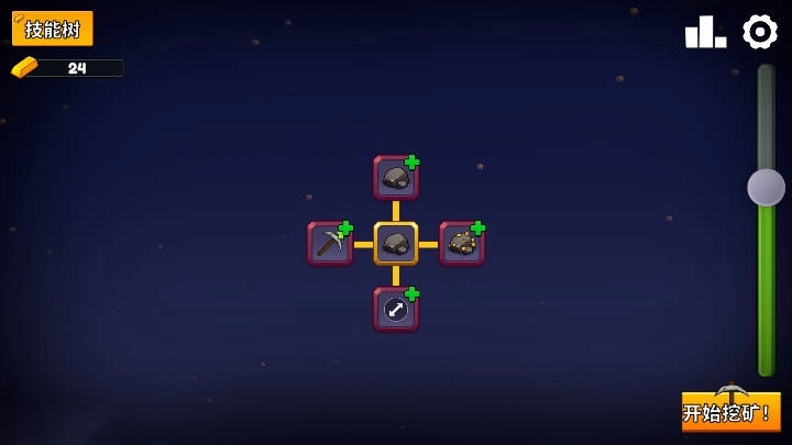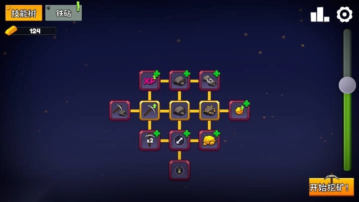 技能树的升级与强化机制如下:当玩家收集到足量的材料锭后,即可开启技能树的升级进程。该技能树包含多个升级分支,如加快开采速率、提升矿石产出量、增强镐头耐用度等。玩家需要结合自身的游戏策略与发展路线,对资源进行合理配置以推进升级。若目标是实现高效开采,可优先选择升级开采速度相关技能;若更看重资源的获取效率,则应重点强化矿石产量技能。每完成一次升级,玩家在后续的挖矿过程中,都能以更强劲的能力应对不同类型的岩石挑战。