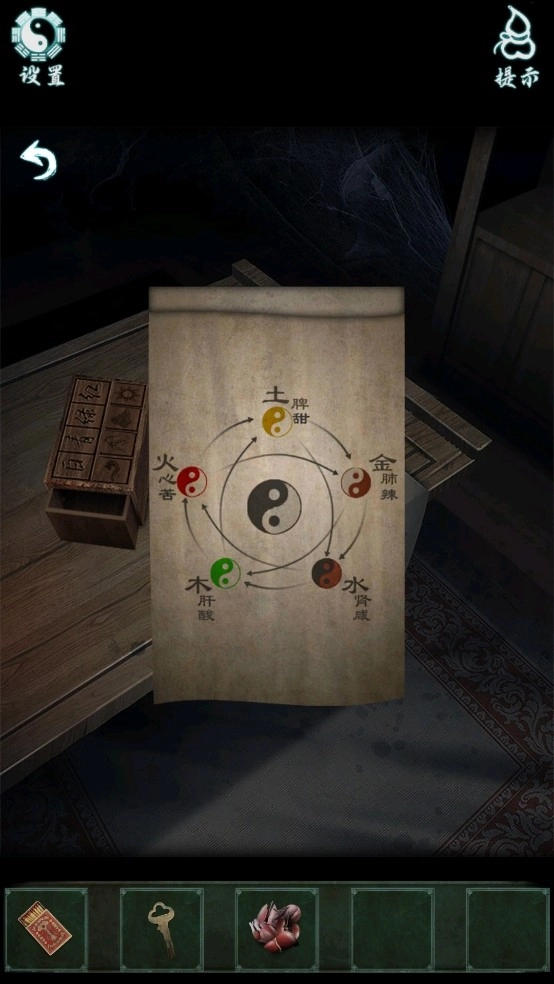 4、点击桌子上的纸条得到提示,按要求放置五脏的位置。之后点击书本得到符箓汇泉符和重要提示。