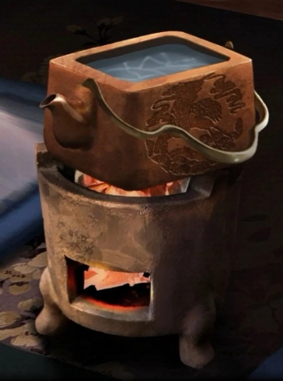 7、回到房间中倒入热水,放进茶宠得到提示,根据图案提示解开下图的盒子得到青花瓷球。