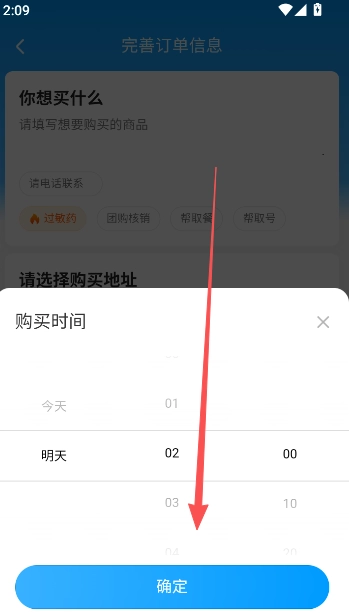 完善订单信息:包括商品的名称和类目、购买地址,以及帮买时间(即预约配送的时间)等内容。