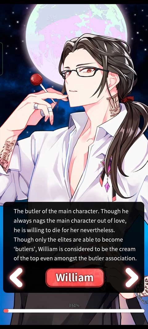 女主角的管家。尽管主人常因关爱而念叨不停,他却依然甘愿为她赴死。虽说唯有精英方能担任“管家”一职,可即便在管家协会里,威廉也算得上是顶尖的精英人物。