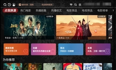 打开后默认会提示可以更换首页的源,只需点击导航栏第一个【点我换源】按钮即可操作,悦享影视同时支持点播与直播功能。