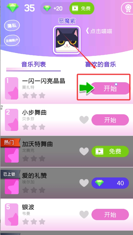2. 在音乐列表里挑选想要弹奏的歌曲,接着点击开始。
