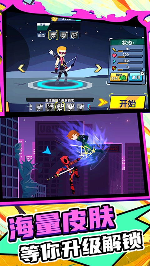 点击“开始”按钮进入关卡后,能查看角色的各项状态,包括攻击、血量、能量、暴击等属性;消耗金币或钞票可以升级这些属性,从而提升战力,以便应对后续的挑战。