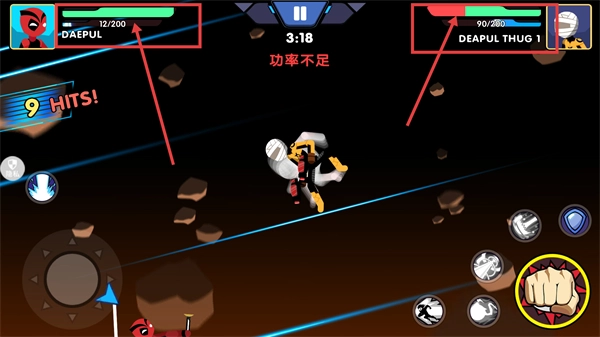 时刻留意自己的绿色血量条与敌人的红色血量条,通过灵活走位来避开伤害,保持持续攻击以消耗对手,同时注意“功率不足”的提示信息,适时调整战斗的节奏。