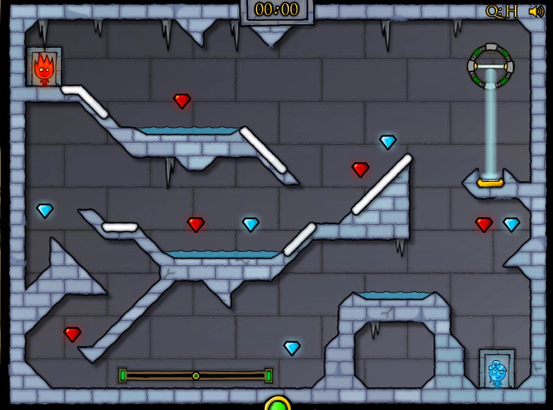 操控与液体颜色一致的角色推动石块,在液体区域铺设通路,以便让另一个冰火人顺利通过。