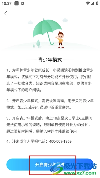 进入新界面后,能看到青少年模式的相关介绍,接着点击页面下方的“开启青少年模式”按钮即可。