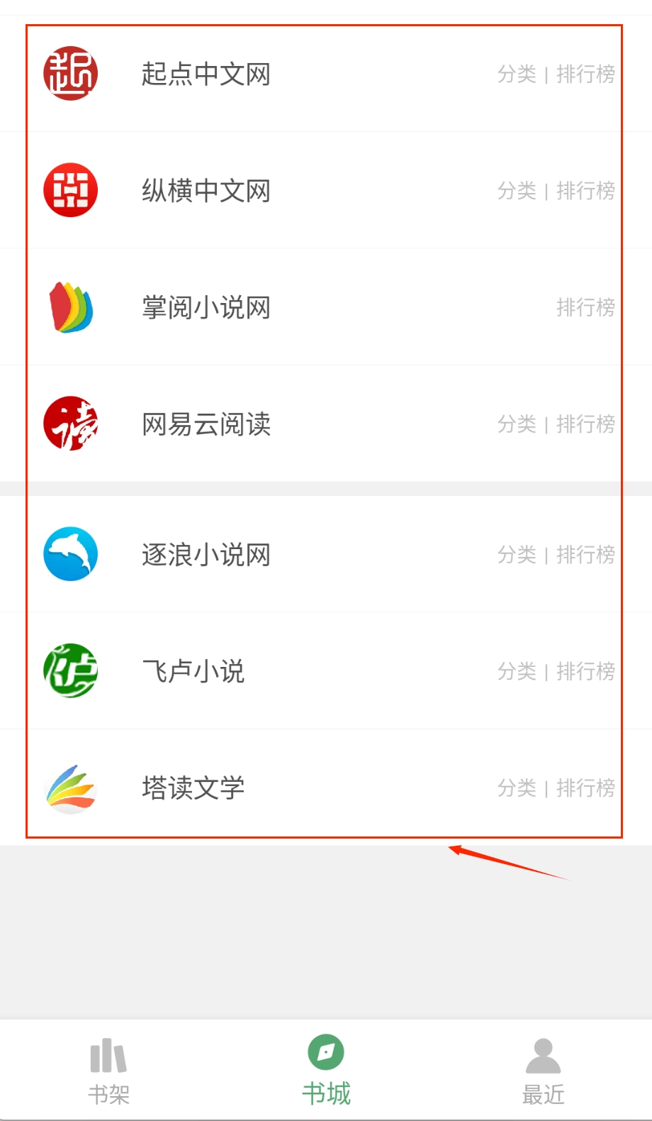 书城页面整合呈现各合作平台入口,点击起点、纵横等平台标识,即可一站式进入不同书库获取资源,无需安装多个应用,省去繁琐操作。