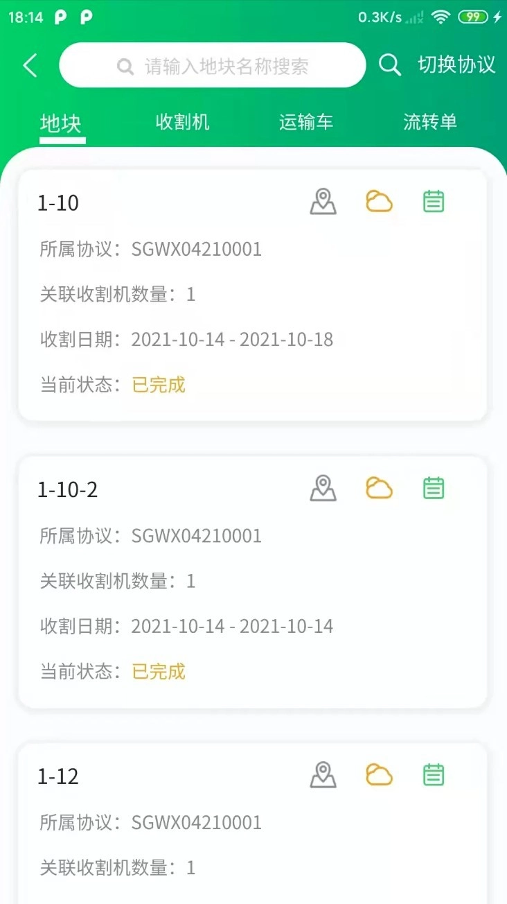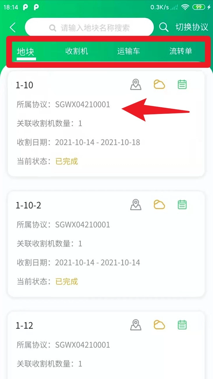 切换到地块标签页后,就能查看当前协议下各个地块的作业情况,具体包含已完成的状态、收割的时间以及对应的设备编号等信息。